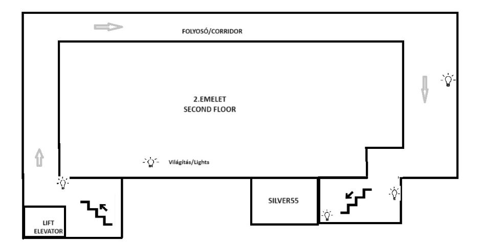 Lift: on mezzanine floorWalk along the corridor on second floor to the staircase, downstairs you will find SILVER55 apartment. We marked the switches of the lights on the map.